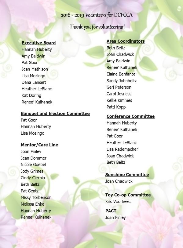 | Applicant: Amy Baldwin Former Positions: Area Coordinator Facilitator, Secretary, Mentor, Newsletter Background/Expertise: Experience, communication and organization Reason for applying? I enjoy being involved and working with a great group of women. _____________________________________________________________________________ Position: Training Coordinator Applicant: Beth Beltz Former Positions: Area Coordinator Facilitator, Fundraiser Coordinator and MLFCCA Representative Background/Expertise: In my years as a provider, as an area coordinator and as the Area Coordinator Facilitator, I have attended many trainings through DCFCCA and other places. I have met many trainers which would be beneficial in this position. Reason for applying? I feel DCFCCA has done and continues to do great things for family child care providers. I would like the opportunity to contribute to this. ______________________________________________________________________________ Position: Membership Coordinator Applicant: Cindy Bills Former Position: None Background/Expertise: Whatever is needed. Reason for applying? To do my part for the association and our profession. ______________________________________________________________________________ Position: Website Coordinator Applicant: Melissa Enke Former Position: Mentor Coordinator, Fundraiser Coordinator Background/Expertise: I am a fast and motivated learner. I have experience being on the board in the past. I am active in different programs for my child care program, and I am an early childhood trainer and teach in many areas of Minnesota. Reason for applying? I would love to serve on the DCFCCA board because I love giving back to an association that has taught me so much and has helped me become the provider I am today. __________________________________________________________________________ Position: Mentor Coordinator Applicant: open Nominations will be accepted from the floor. |